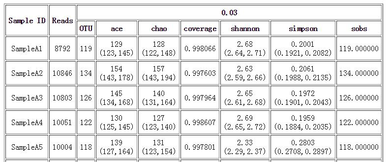 主要分析每個樣本中微生物群落本身的多樣性,主要有群落豐富度指數(Chao指數和Ace指數)和多樣性指數(Shannon指數和Simpson指數)。
